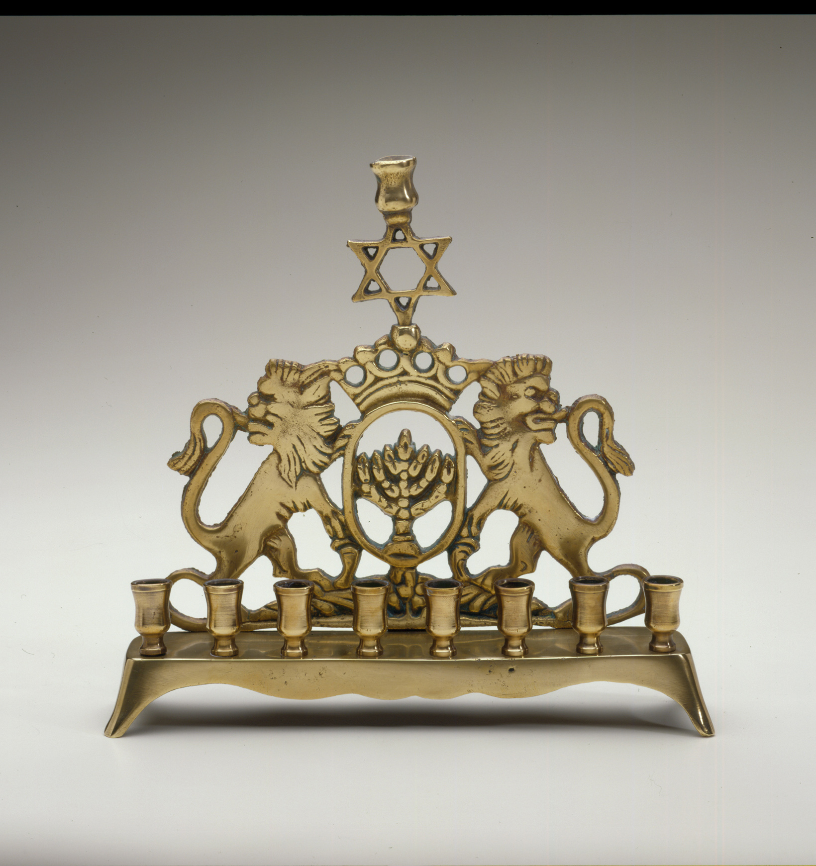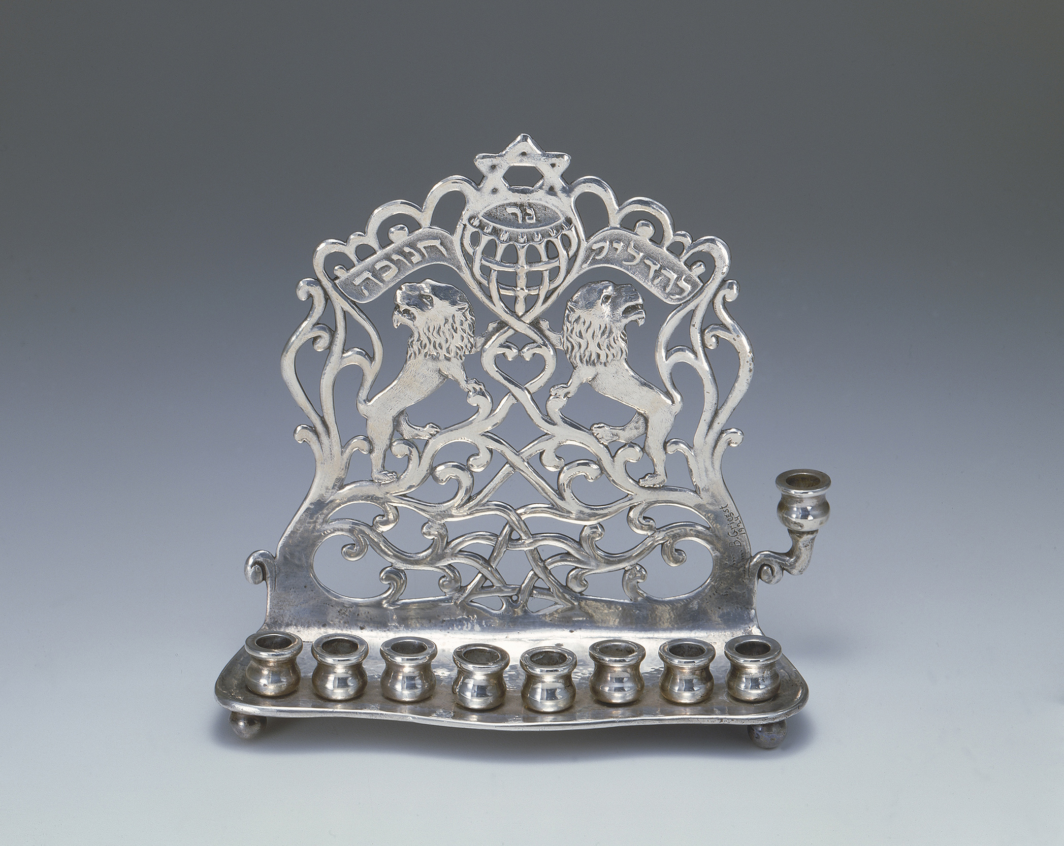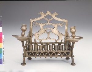 The festival of Hanukkah commemorates an ancient victory for religious freedom – the liberation and reestablishment of Jewish worship in the Temple in Jerusalem in 164 BCE. According to legend, a miracle occurred as the Jews gave thanks for divine intervention. A one-day supply of consecrated oil necessary for worship burned for the entire eight-day celebration. One of the most popular and beloved Jewish ceremonial objects, the Hanukkah lamp has evolved over the centuries for the kindling of lights during the eight nights of Hanukkah. The Jewish Museum’s collection of Hanukkah lamps reflects the multitude of places where Jews have lived and flourished, as they often incorporate local styles and motifs. The design and history of each lamp speak to a complex interaction of political events, Jewish law, artistic expression, and personal experience. The millennia-old tradition of kindling the festival lights on a winter’s evening continues to have profound meaning around the world as a celebration of freedom and miracles.
