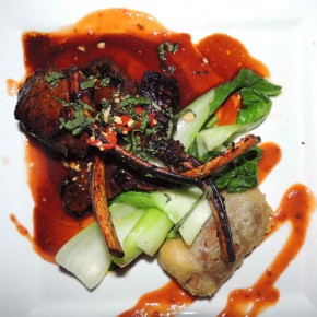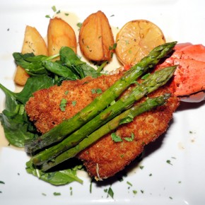 My party’s “Entrée” selections were the Lobster Milanese ($34) served atop a preserved lemon-caper beurre blanc and accompanied by grilled asparagus and Yukon potatoes; and the Charbroiled Rack of Lamb ($42) with honey roasted garlic and hoisin-adobo marinade and served with bok choy and crispy miso eggplant and a honey-ginger reduction. Other entrée notables on the menu include the Macadamia and Coconut Crusted Sea Bass ($28) with crispy sea beans, roasted pineapple salsa, mashed sweet potato with lime and a ginger-lime beurre blanc; and the Bruleed Pork Porterhouse ($29) with fig jam, pan roasted pork belly, Brussels sprouts and sweet potato hash with a prosciutto demi.