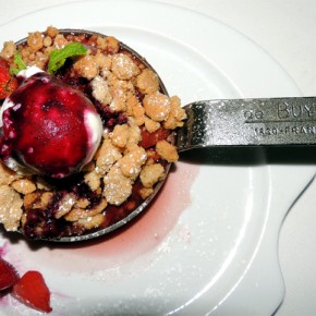 On the side, I opted for the Pomegranate-Molasses Brussels Sprouts ($8) with black pepper bacon, golden raisins, and raspberry vinegar that was kicked up a notch with orange zest. For dessert, my choice was Vintana’s peach and blueberry cobbler topped with house made ice cream. Southern hospitality indeed.